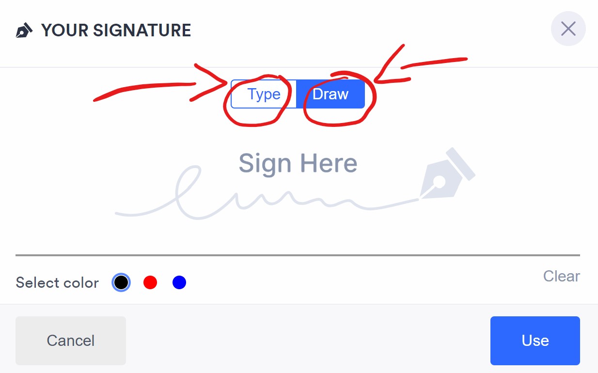 Cliccando il campo "firma" si aprirà una finestrella in pop-up (Fig.1) che permetterà di scegliere se disegnare ("Draw") oppure digitare ("Type") la propria firma.